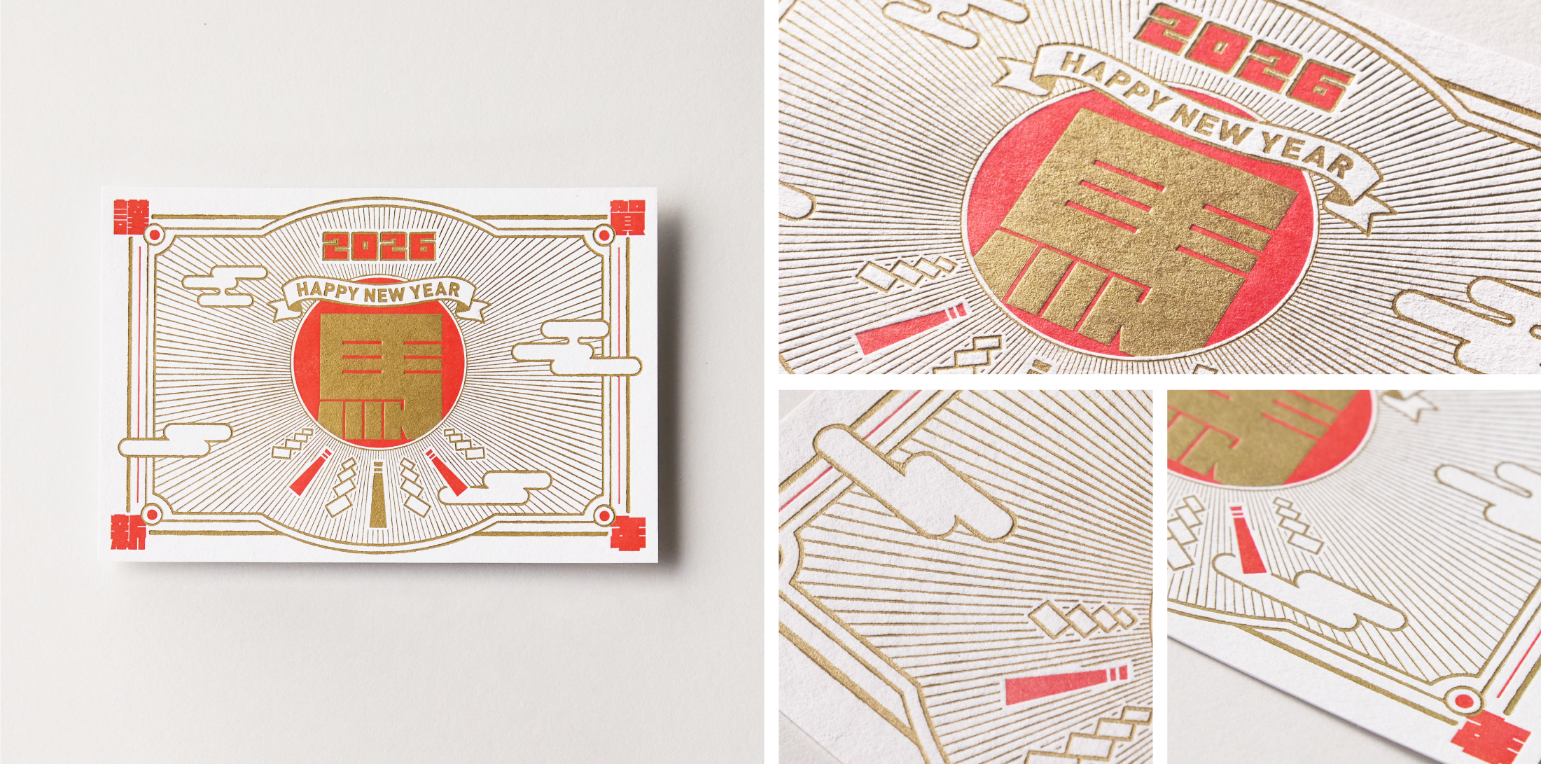 放射状に広がる罫線は、年賀状に触れた時にしっかりと活版印刷の凹凸が感じられるのが特徴です。